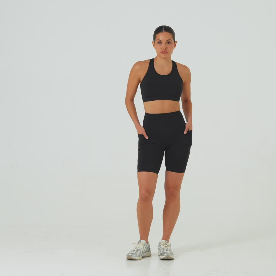 Our AM2.0 (20cm inseam) mid-length biker short (with no front seam) is designed for workouts, runs, yoga, and recreation. It's half-matte, super stretchy and crafted from certified post-consumer waste. Also available in a longer 25cm inseam.