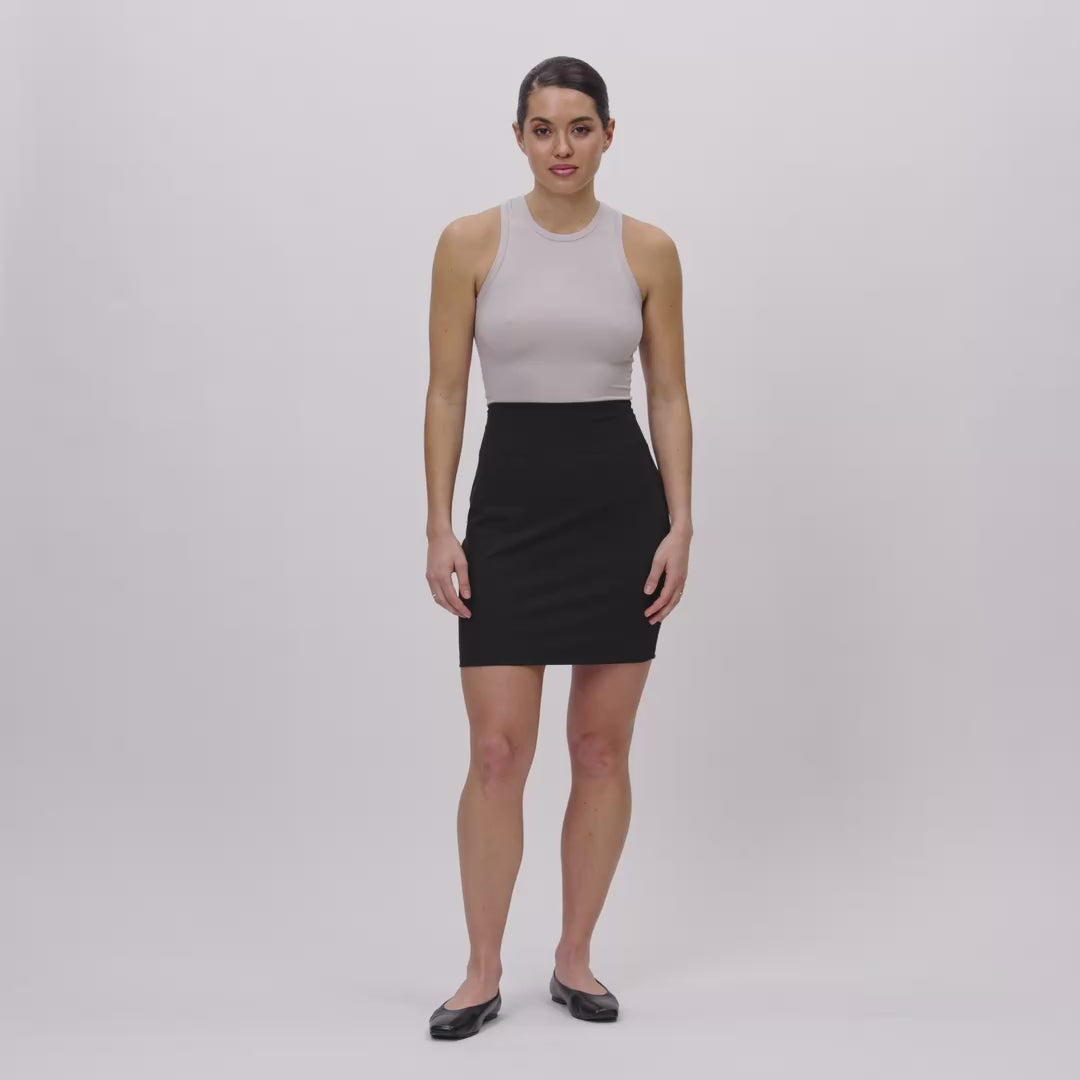 This short skirt boasts a sophisticated aesthetic with the comforts of activewear. Its high-waisted, pencil silhouette and subtle middle back slit promise ease of movement while making a style statement.